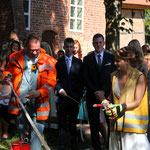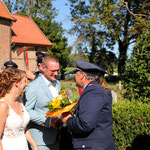 Vor der Kirche erwartete das frisch vermählte Paar eine kleine Überraschung: Gemeinsam als Paar musste ein Feuer gelöscht werden.